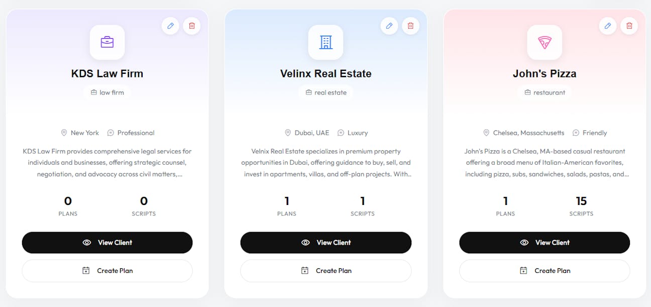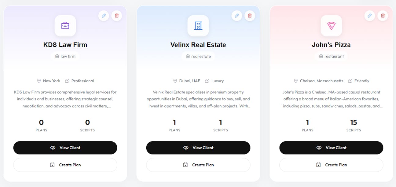Each client has their own isolated workspace with their brand profile, content calendars, scripts, and videos.