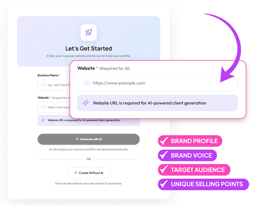 ✅ 10-Minute Client Onboarding from Any Website URL (AI extracts brand voice, audience, USP automatically)