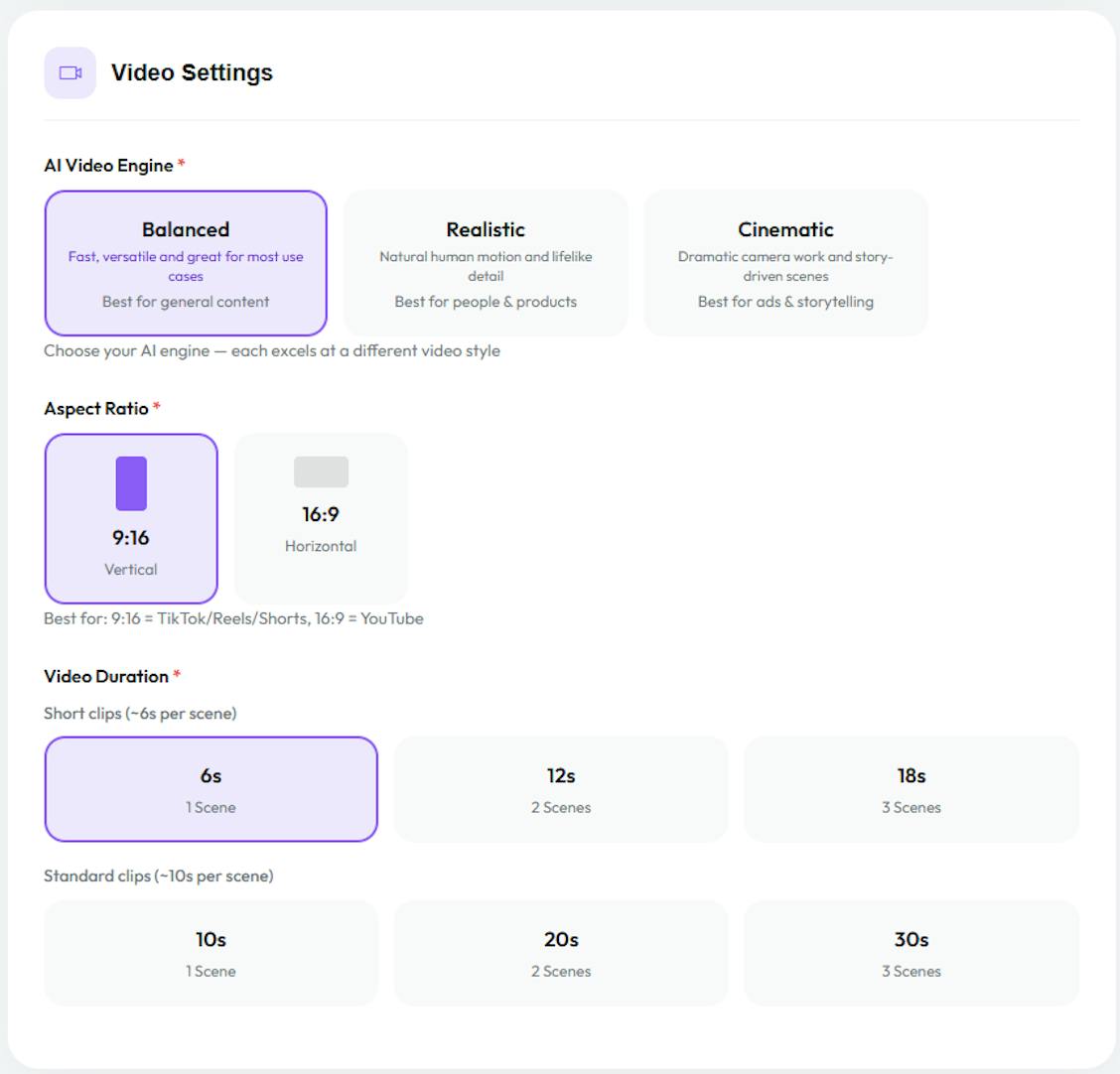 ✅ Flexible Video Formats (9:16 for TikTok/Reels or 16:9 for YouTube, multiple duration options)