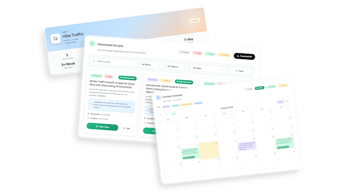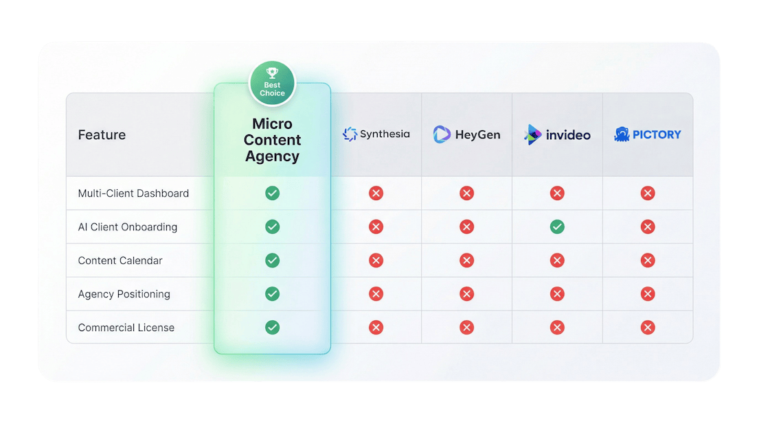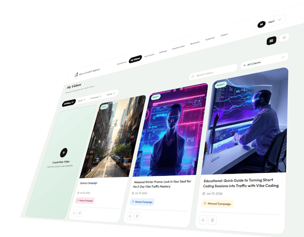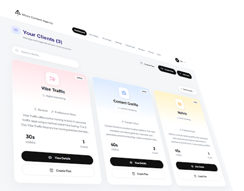 Those are monthly subscription tools ($18-$149/month) designed for individuals creating videos for themselves. They don't have multi-client dashboards, AI client onboarding, or 30-day content calendar automation. Micro Content Agency is built specifically for running video content agencies or service businesses.