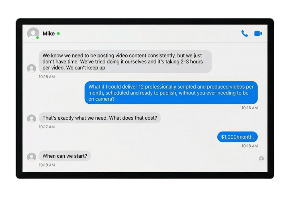 Today, he charges clients $300–$2,000 per month for video content that takes him just a few hours per client. He teaches other agency owners the system — and he’s home for dinner.